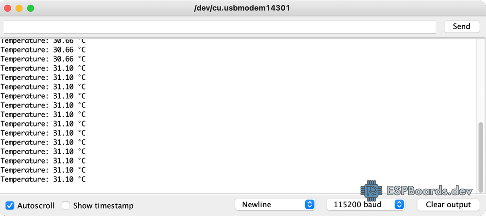 Wait for some time and you should start seeing the logs being printed in Serial Monitor, showing the internal ESP32 chip temperature. If everything is fine, you should see more or less stable temperatures being shown in each new line. This is probably ok and that is the normal ESP32 working temperature.