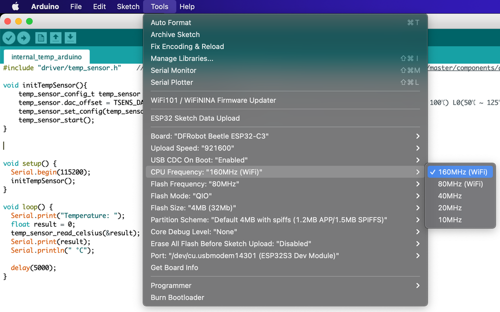 In our case, as we are using the DFRobot Beetle ESP32-C3, the maximum available option is "160 MHz (WiFi)".