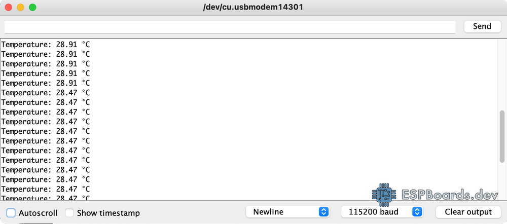 }That's it! We have successfully set up the ESP32's in-built temperature sensor with the Arduino IDE. The serial monitor should now display the ambient temperature in degrees Celsius, updating every five seconds.