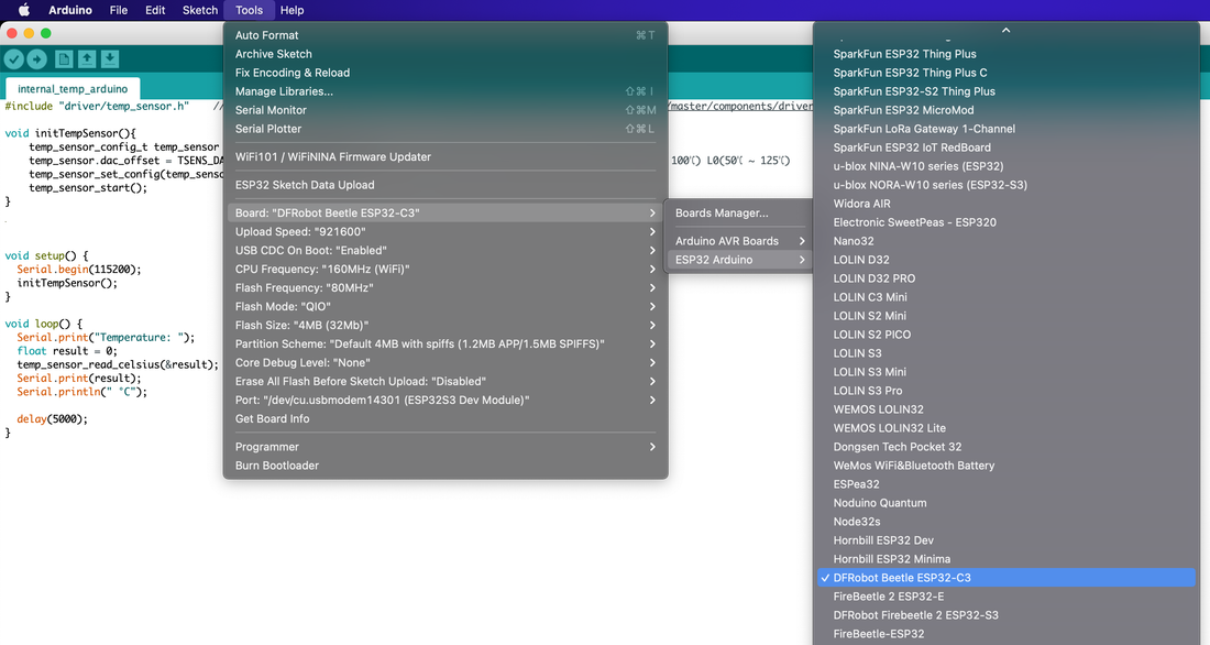 - ESP32 board, that has the internal temperature sensor (We are using the DFRobot Beetle ESP32-C3 for this example).