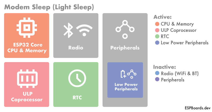 In ESP32 Light Sleep mode, the Radio is shut down, meaning there are no RF capabilities in this mode. Most of the peripherals are also off, excluding the Low Power Peripherals. By configuring wake-up sources intelligently, you can significantly reduce energy consumption.