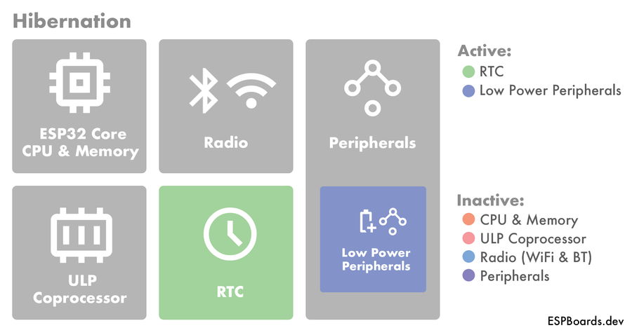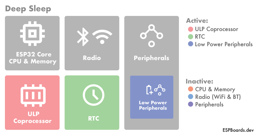 Among the most power-efficient modes in ESP32, deep sleep turns off the main ESP32 Core, which includes main processing power and memory, resulting in minimal power usage.