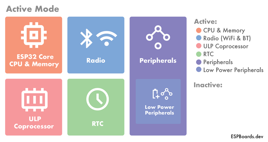 In this blog post, we've explored the ESP32 SoC in more detail, looking at the different parts the chip consists of. We have then explored the different ESP32 Power Modes and learned which parts are getting shut down in different modes.