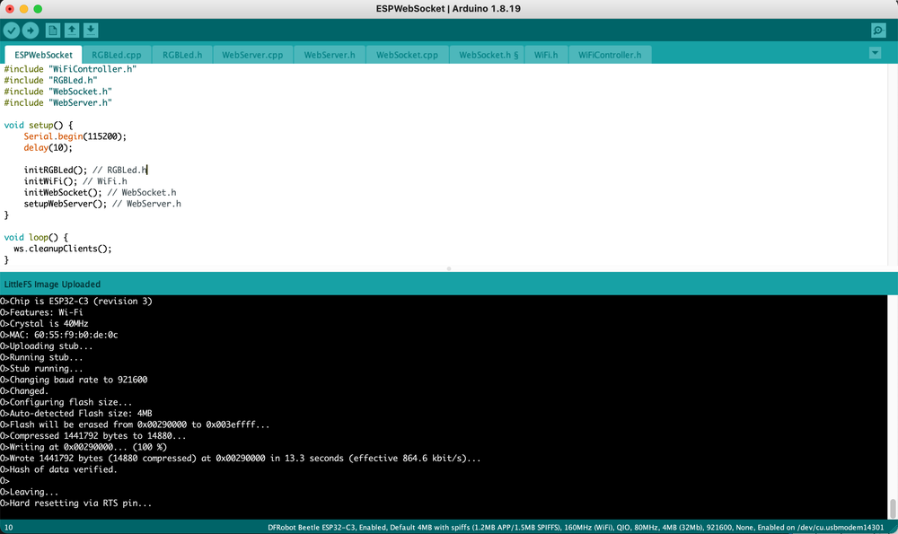 }First, we include the other files we created earlier. Next, initialize the Serial port to be able to see the logs and debug our application with the Serial monitor. Next, we will call functions initRGBLed from the RGBLed.h file, initWiFi() from the WiFiController.h file, initWebSocket() from the WebSocket.h file and initWebServer() from the WebServer.h.