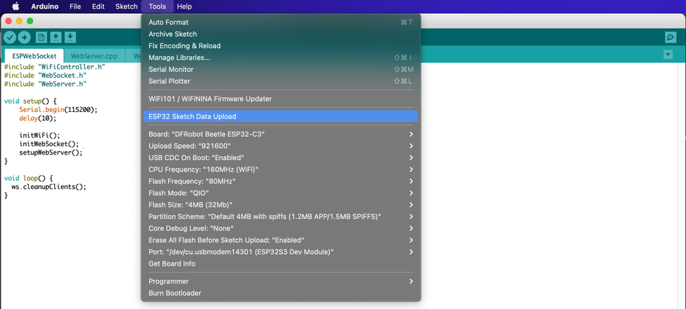After installing the tool and restarting the Arduino IDE, under tools you should see a new item "ESP32 Sketch Data Upload":