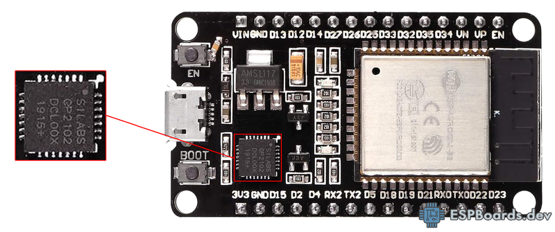 On the other side, we've got the CP2102. This one's a bit fancier and tends to be a bit pricier. The CP2102 is known for its stability and ease of use. It's like the smooth operator of USB-to-UART – maybe a bit more polished than its CH340 counterpart. It's often the choice for more professional applications where reliability is a top priority. You can see how to identify the CP2102 USB-to-UART bridge controller chip on the NodeMCU-32S development board above.
