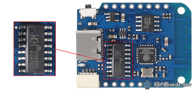 First up, we've got the CH340. It's a budget-friendly option that's gained popularity for its affordability. This chip does the job of converting data between USB and UART, making it a go-to for a lot of DIY and hobbyist projects. It's like the reliable underdog, quietly getting the job done without breaking the bank. You can see how to identify the CH340 USB-to-UART bridge controller chip on the D1 mini development board above.