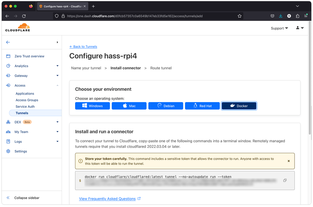 In the Cloudflare dashboard, in the section "Choose your environment" and select "Docker". "docker run" command will be provided for you. We will use it in a moment.