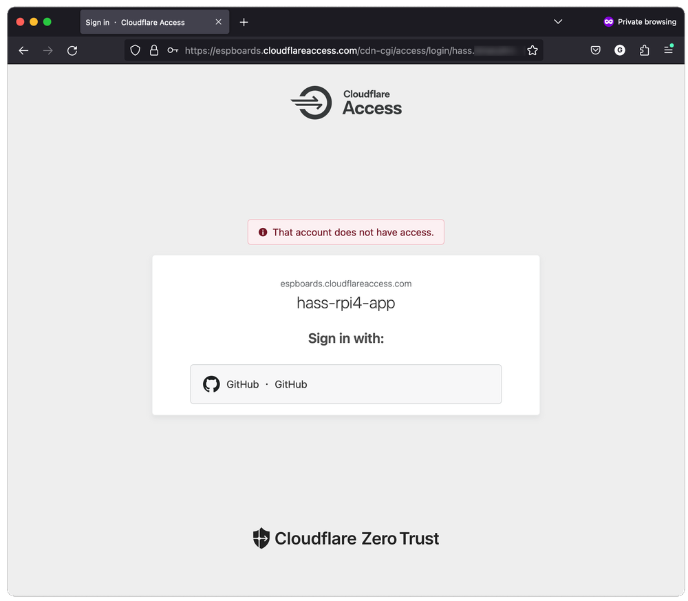 OK, so we have tested the happy scenario for ourselves. But we still don't know if other people cannot access our Home Assistant after simply logging in with GitHub. To test this out, open a private window in your browser. Enter your Home Assistant URL and you will see the Cloudflare Access page again. Select "GitHub" and log in with a different GitHub account. In case you don't have one, you will have to create it for the sake of this test. You should get an error this time because we only allow access only with one email address.