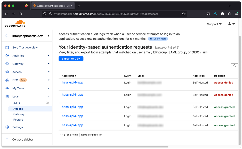 Go to "Zero Trust" and select "Logs" -> "Access". Here you will see the authentication requests to the Cloudflare Access application we created earlier (Where we have to log in with GitHub).