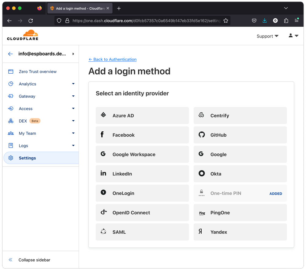 In Cloudfront, under "Zero Trust", go to "Settings" -> "Authentication" and under "Login methods", click "Add new".