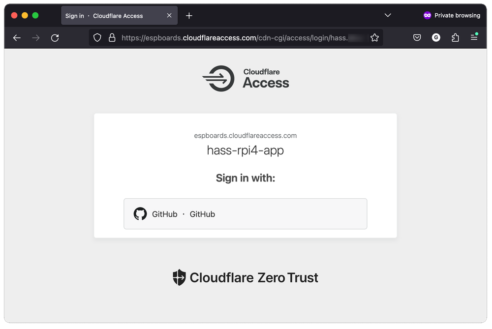 To test our new security setup, simply open your Home Assistant in the web browser (in our case hass.example.com). Instead of the Home Assistant Login Page or Dashboard, you used to see before, you should now see the Cloudflare Zero Trust Access page with GitHub as a sign-in option.