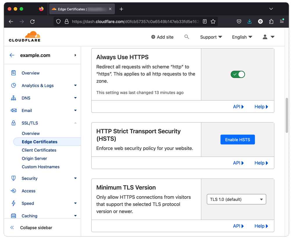 Our access to Home Assistant is working perfectly fine with HTTPS now, but it also works with HTTP and we want to avoid that. In CloudFlare Dashboard, go to "SSL/TLS" -> "Edge Certificates".