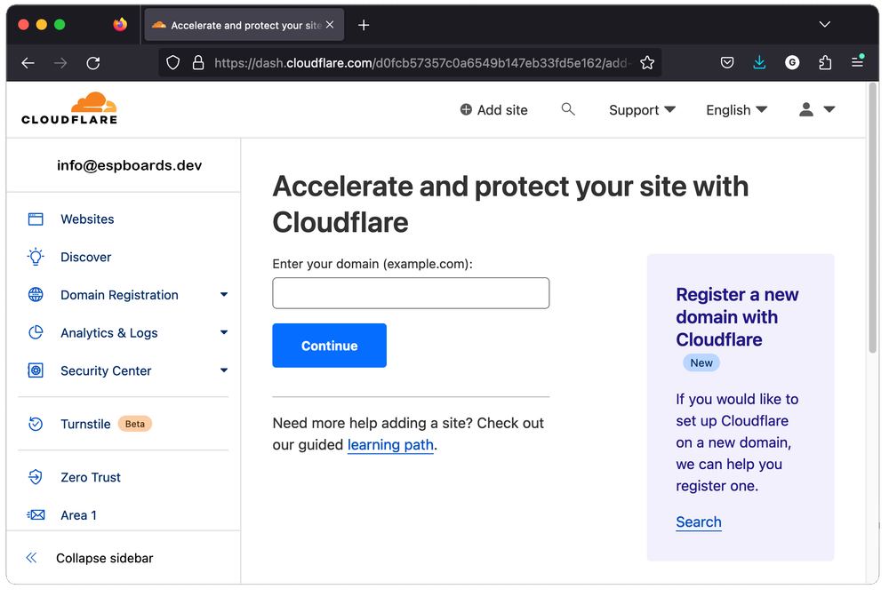 Login to your Cloudflare account and go to "Websites" -> "Add a site". Enter your domain name and click "Continue", and select the free plan.