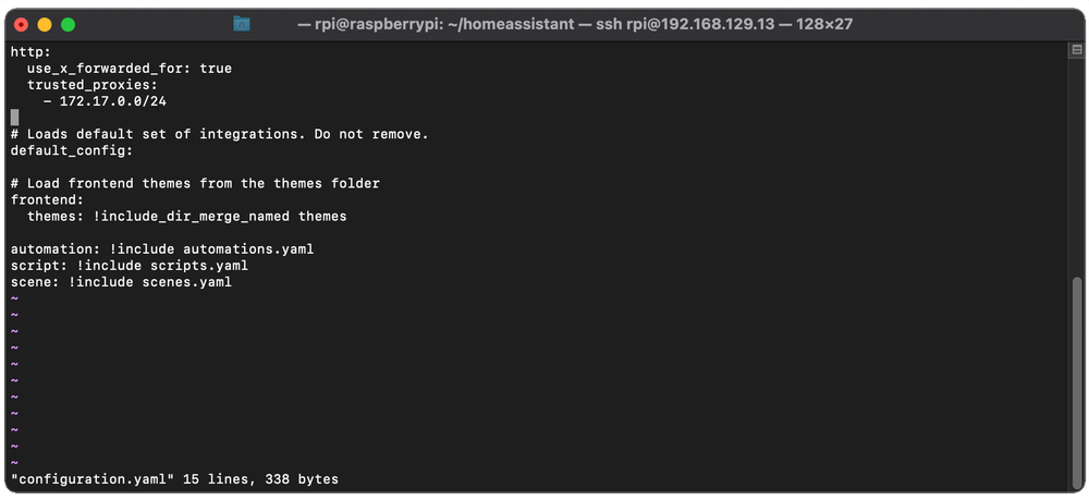 Let's open the Home Assistant configuration on our Raspberry Pi. With the SSH connection to Raspberry Pi, type