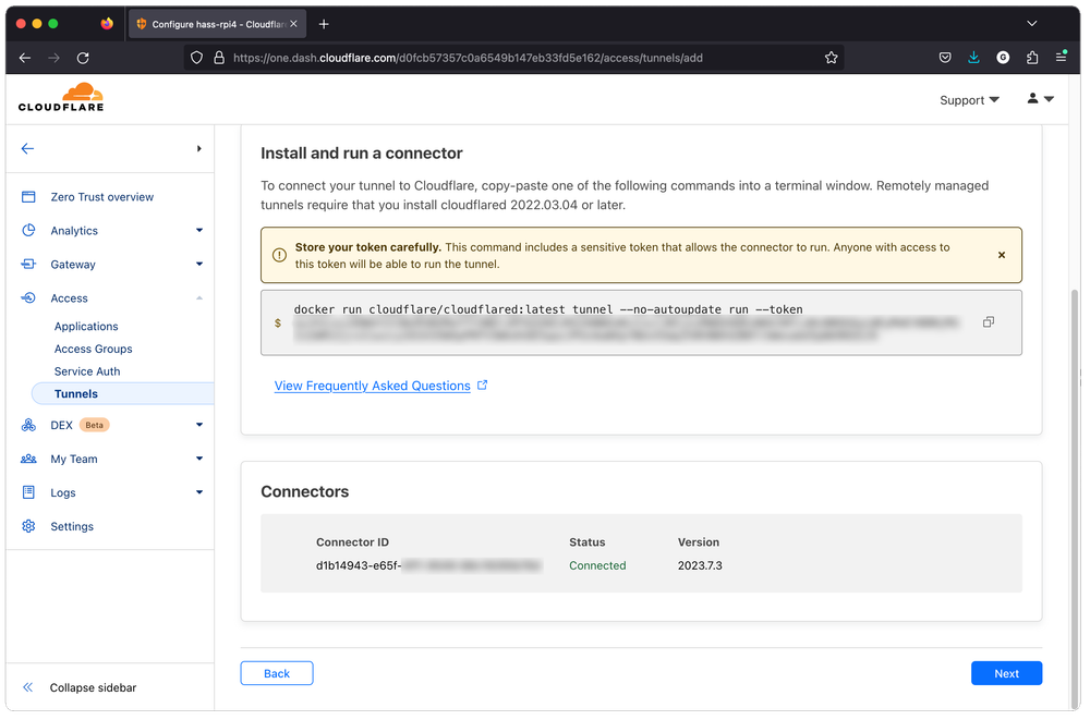 docker start cloudflare- Check the Connector Status After successfully running the Cloudflare Tunnel Connector inside Docker Container, you should see a new Connector appear under “Connectors” with the status "Connected". Click "Next".