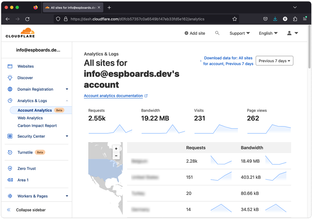 In Cloudflare Dashboard, go to "Analytics & Logs" -> "Account Analytics". Here, you can see how many times your domain was visited, the countries from which it was accessed and more.