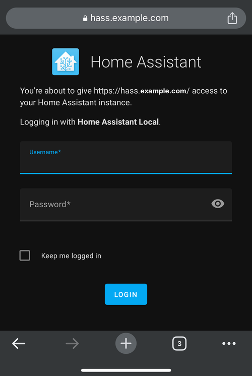 Once again, grab your phone or other device, that is connected to a different network than your home, open the browser and refresh the page (in our case hass.example.com).