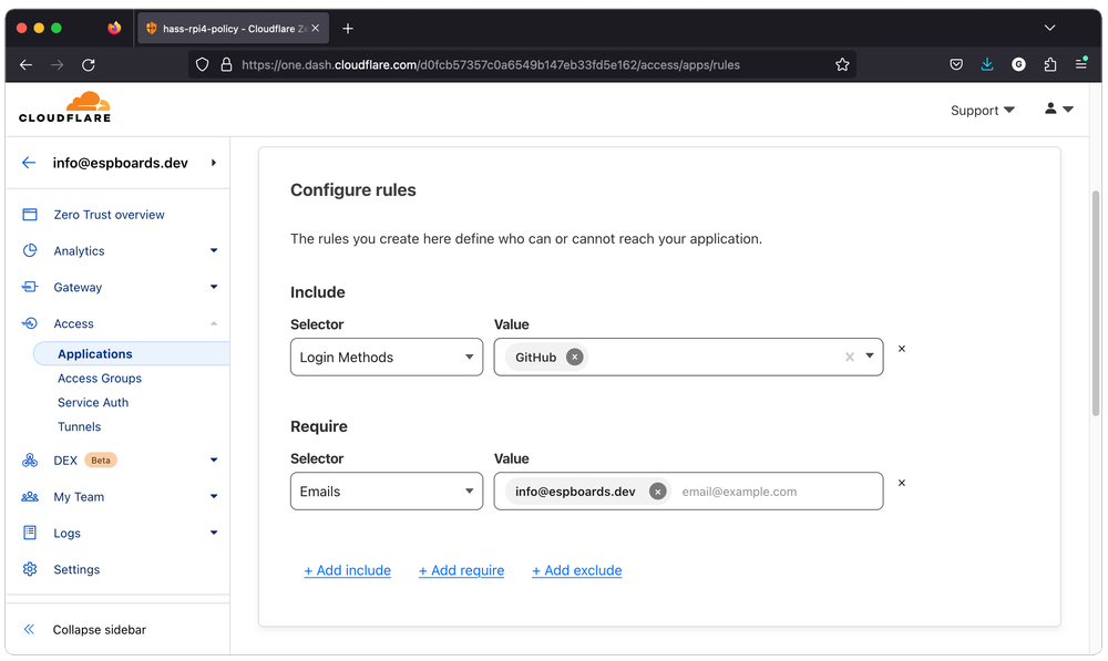 Under "Configure rules", create a new "Allow" rule - Selector "Login Methods" => "GitHub" only. Create a new "Require" rule, Selector "Emails" => your GitHub account email address.