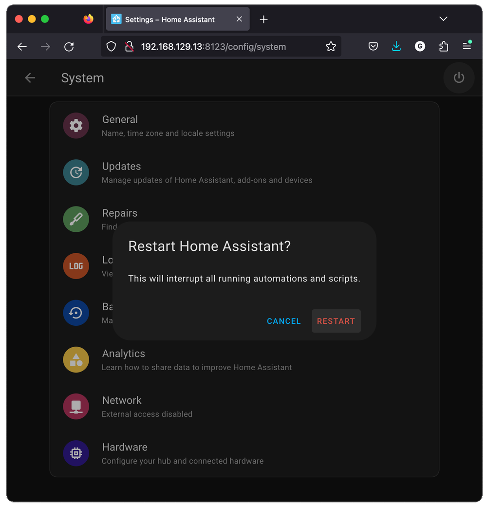 For the changes to be applied, we need to restart the Home Assistant. We can do that through the Home Assistant Web Interface. Open your Home Assistant interface in the browser and go to "Settings" -> "System".