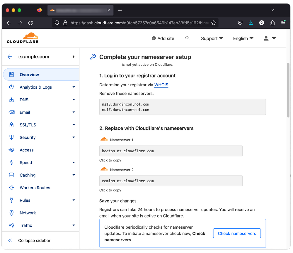 After you have changed the name servers of your domain, click “Check nameservers” on the Cloudflare dashboard. If the settings are correct, you will see a confirmation message.