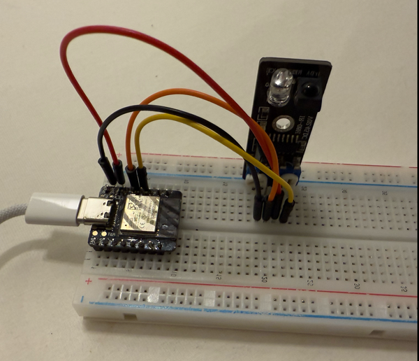 - Connect the VCC pin of the IR-O8H to the 3.3V pin on the ESP32.