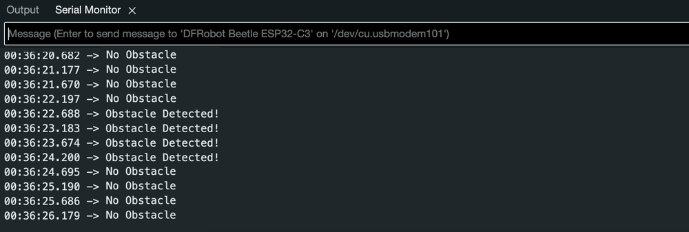 - Observe the Output: The Serial Monitor should display "Obstacle Detected!" when an object is within range and "No Obstacle" when the area is clear.