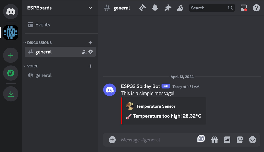 In this post we have created an example program for ESP32 that sends a message to Discord channel, using Discord Webhooks. We have tested different scenarios, such as sending a simple text and sending Discord Embeds, which allow better message formatting. This example can be used as an example for a more complex application, which would send a message to Discord when sensors connected to ESP32 detect anomalies or similar scenarios.