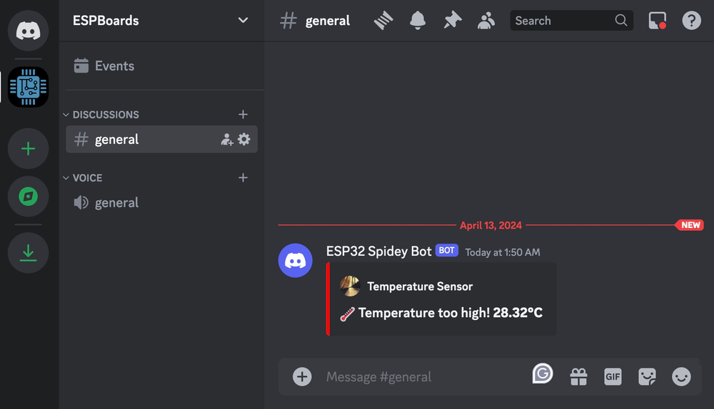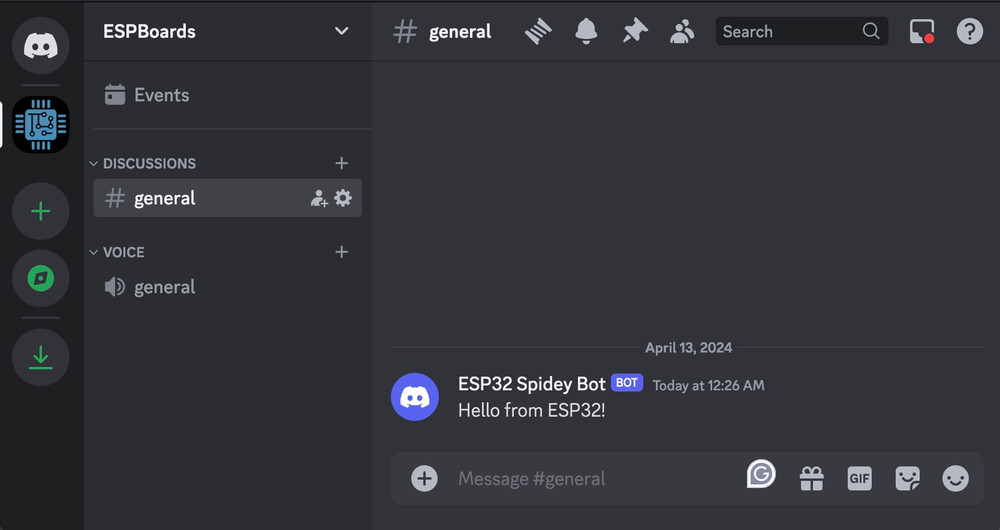 String message = "Hello from ESP32!";And upload the code, after the ESP32 boots and successfully connects to the WiFi network, it will send a message to the Discord Webhook. After a few seconds, you should see the message in Discord: