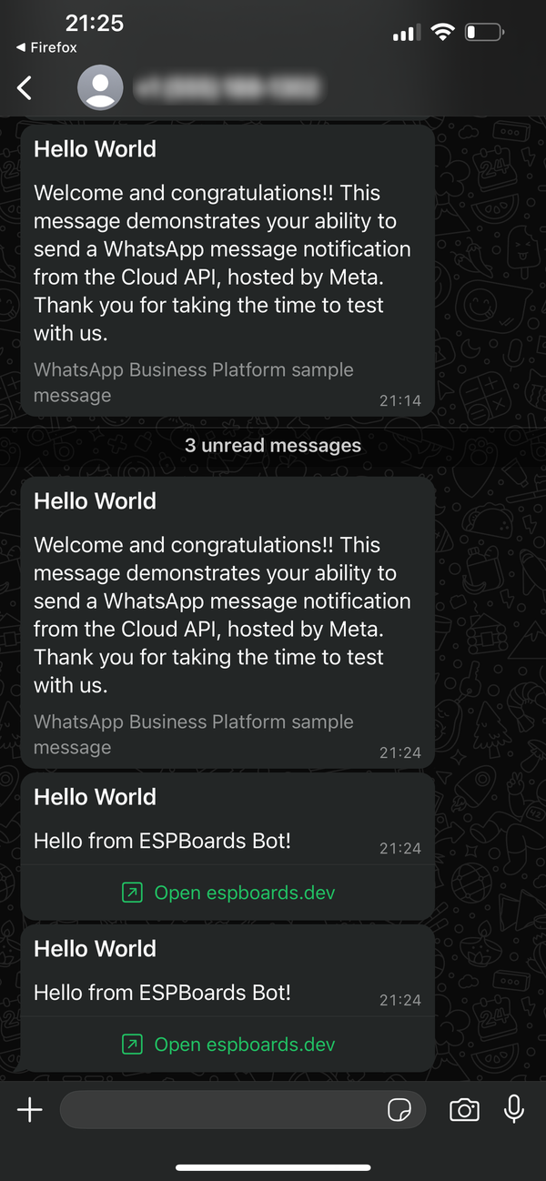 In this blog post, we explored how to leverage the WhatsApp API to send messages directly from an ESP32. We walked through the steps of setting up your environment, creating necessary configurations, and crafting the appropriate JSON payload to send a WhatsApp message.