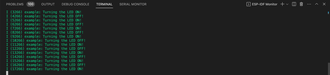 So now we have the blink example on our ESP32 microcontroller. You should see the built-in LED flashing on the board. Additionally, the program should print some output into Serial Monitor, when it turns the LED ON or OFF. To see the output, Click "View"->"Command Palette" and search for ESP-IDF: Monitor your device.