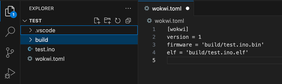 elf = 'build/test.ino.elf'firmwarepoints to the compiled binary that Wokwi will flash into the virtual ESP32elfis used for symbol information like variable names, which improves the simulation experience