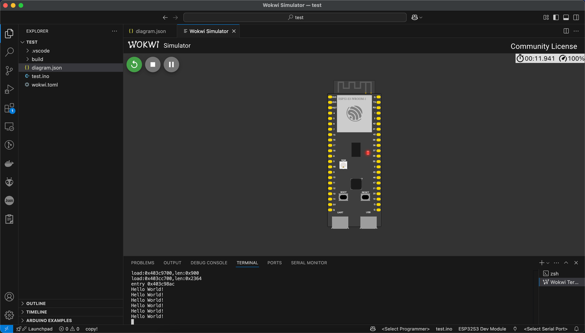 - The Wokwi simulator will launch right inside VSCode, showing your configured hardware