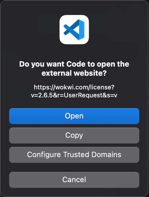 - This opens your browser to the Wokwi website - sign in with your Wokwi account and approve the request