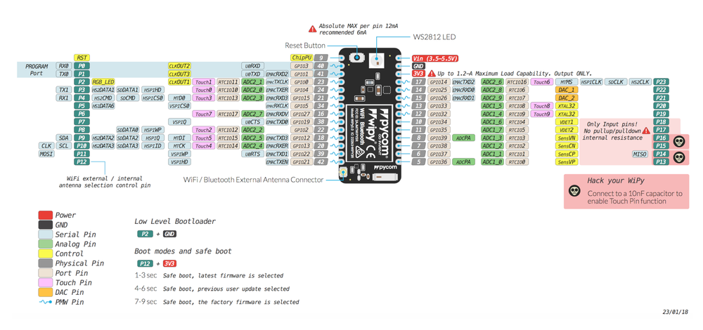 The WiPy 3.0 uses esptool_py for uploads , esp_ota for OTA updates, and esptool_py bootloader at 0x1000.